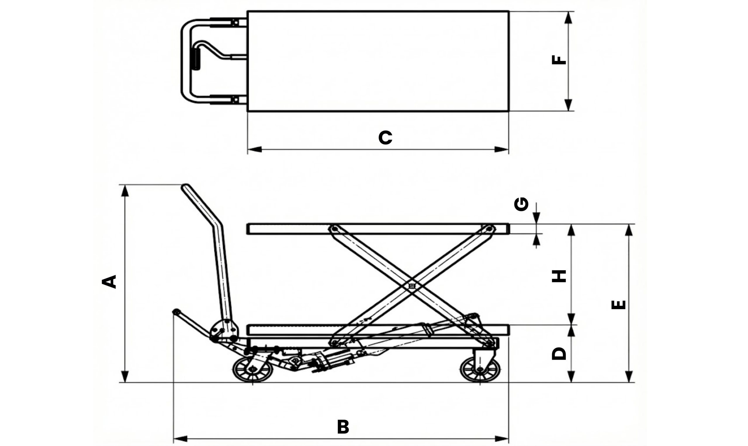 | COD | A | B | C | D | E | F | G | H | Ruote d. | Portata Kg. | Peso Kg. |