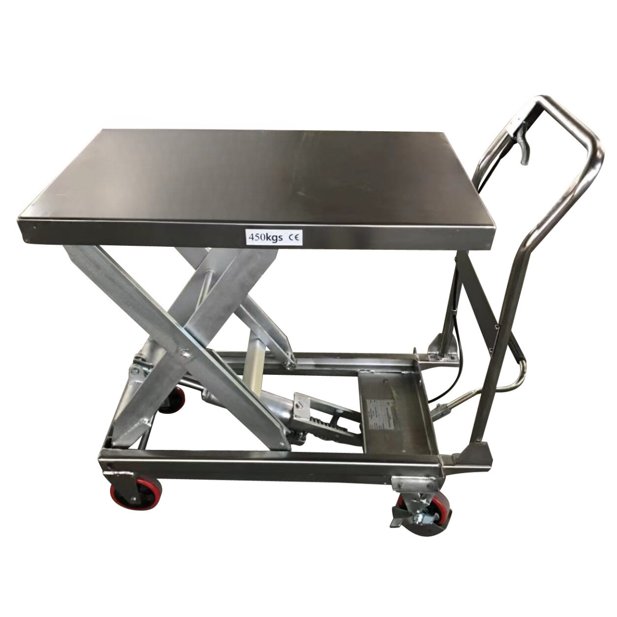 Il carico può essere sollevato mediante pompa a pedale a effetto semplice, mentre la discesa può essere controllata manualmente tirando o rilasciando la leva posizionata sul timone. L’abbassamento avviene senza scatti.